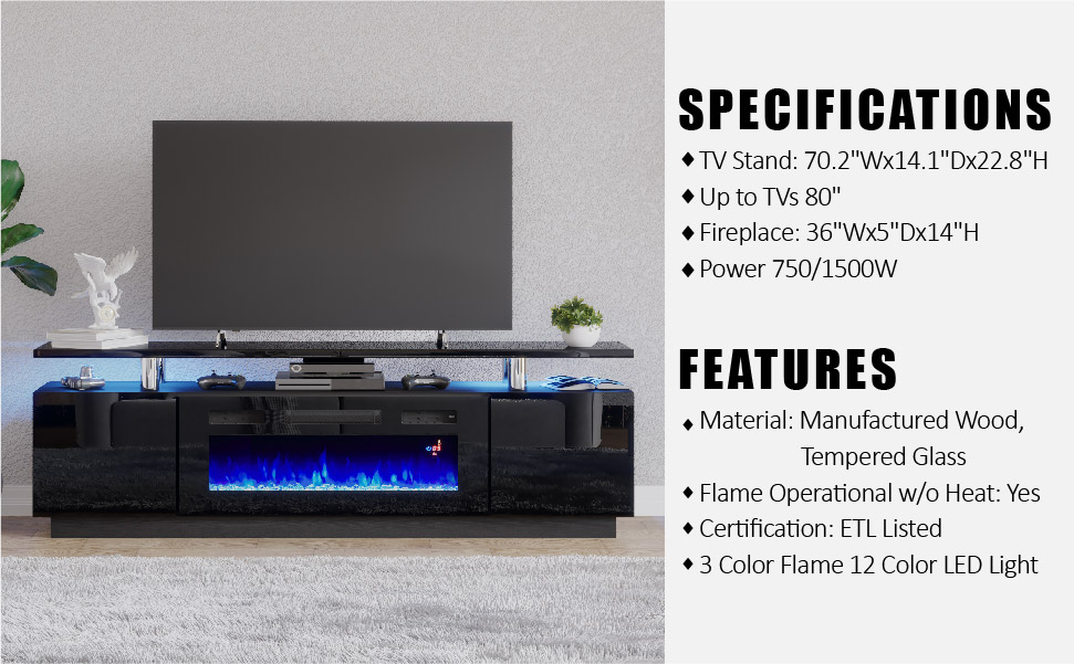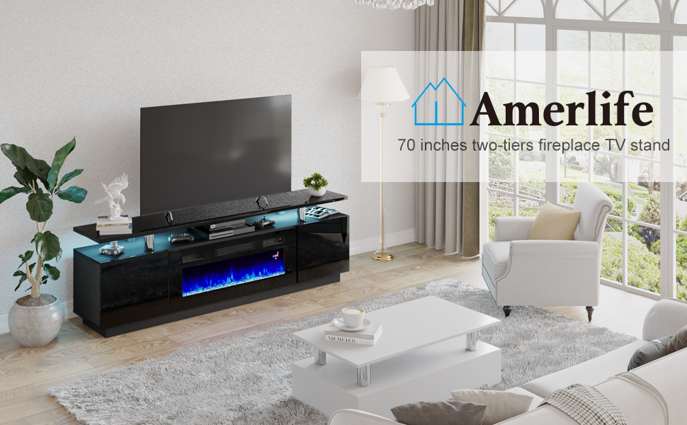 Brand AMERLIFE Power Source Corded Electric Product Dimensions 14.1"D x 70.2"W x 22.8"H Material Engineered Wood, Tempered Glass, Stainless Steel Finish Type Wood grain Installation Type Freestanding Heat Output 5100 British Thermal Units Special Feature 70" Modern High Gloss, Adjustable Flame&LED, Temperature Control & Time Setting, 36" Electric Fireplace, 2 Tier Design Style Modern Color Black Room Type Living Room, Bedroom Included Components Tv stand, Fireplace Item Weight 86.35 Pounds Model Name Large Storage Fireplace TV Stand Shape Rectangular Power Consumption 1500 Watts Warranty Type One Year Item Weight 86.4 pounds