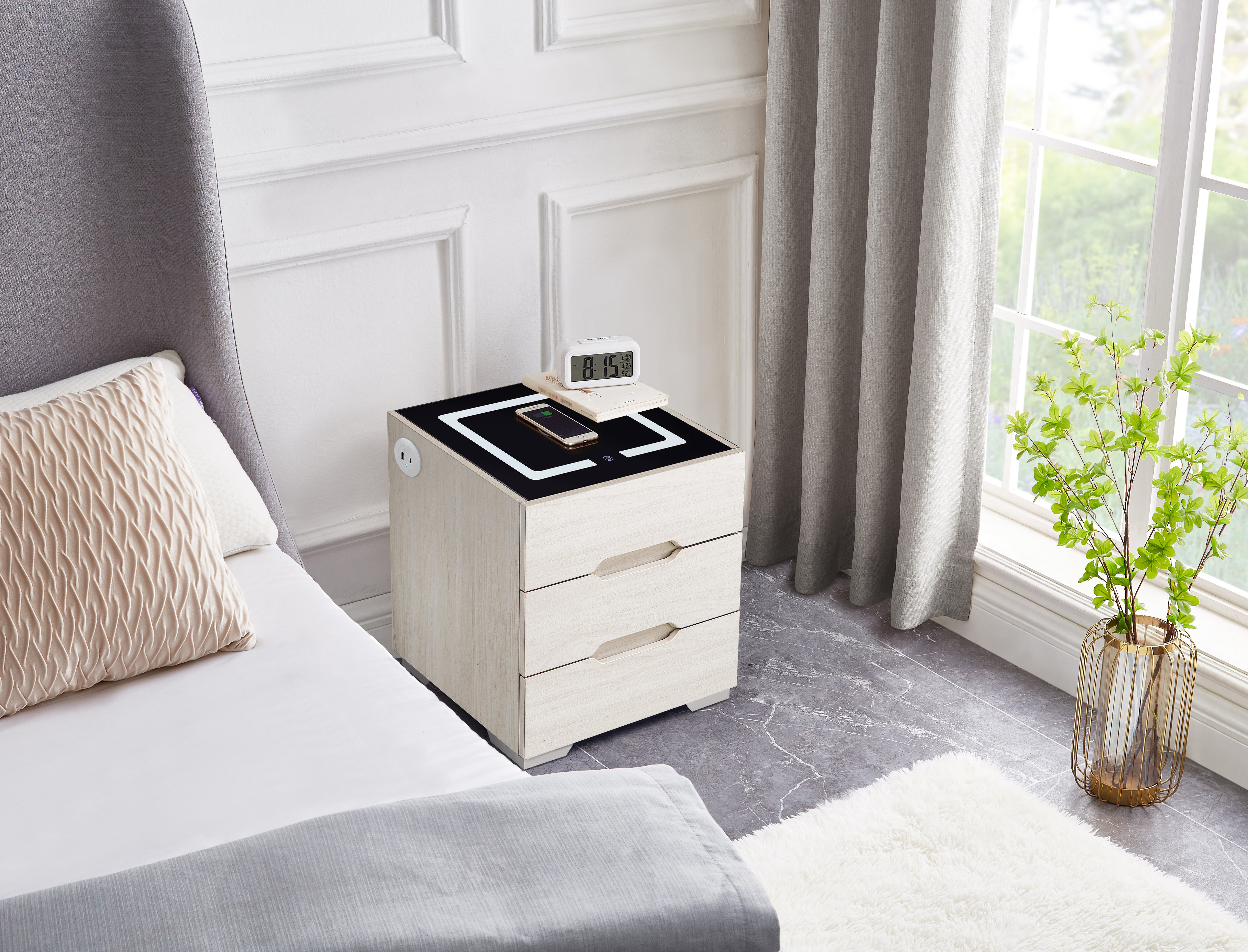 - The smart nightstand is equipped with tempered glass desktop (weight capacity: 35 lbs), which features better wear resistance and also for easy maintenance. Comes with a 3-color LED backlight (warm/cold/natural). Adjustable lighting effects by a simple press touch button.