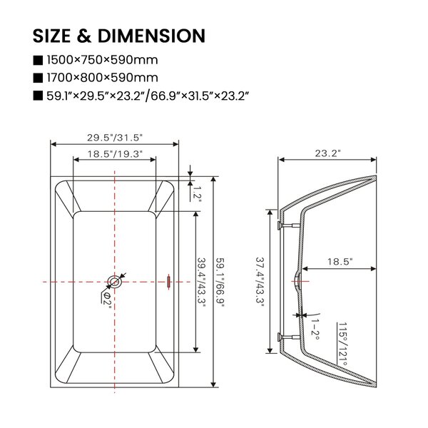 - Flexible drain hose and slotted overflow included, tub filler excluded. Outer dimension (23.4" height x 29.5" wide x 59.1" length); – UPC Certified. We are committed to giving customers excellent after-sales service and products