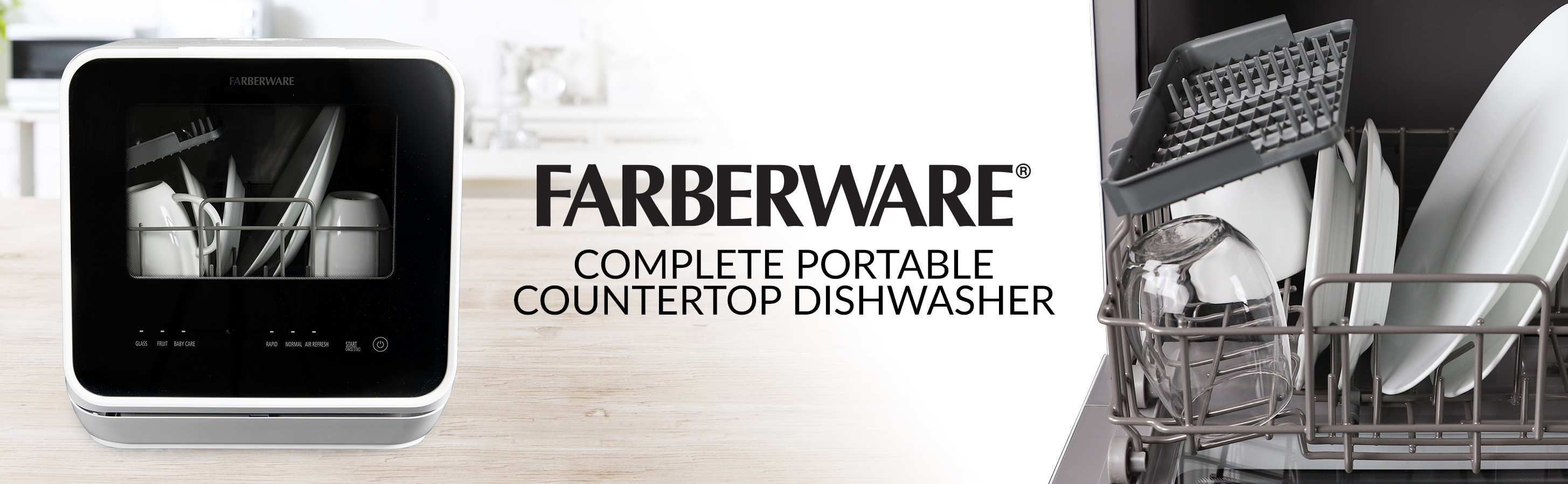 If you have water electricity and 40 minutes you can clean your dishes - anywhere and anytime! Whether it's in your kitchen Camping on your boat or RV or at an event now dirty dishes are a thing of the past The Farberware professional complete dishwasher can be placed on any countertop or sturdy table and gives you the choice of using its built-in water tank or a quick faucet hook-up It offers 6 different wash cycles and can also be used to Steam-Clean baby bottles or give your glassware a sparkling clean finish.