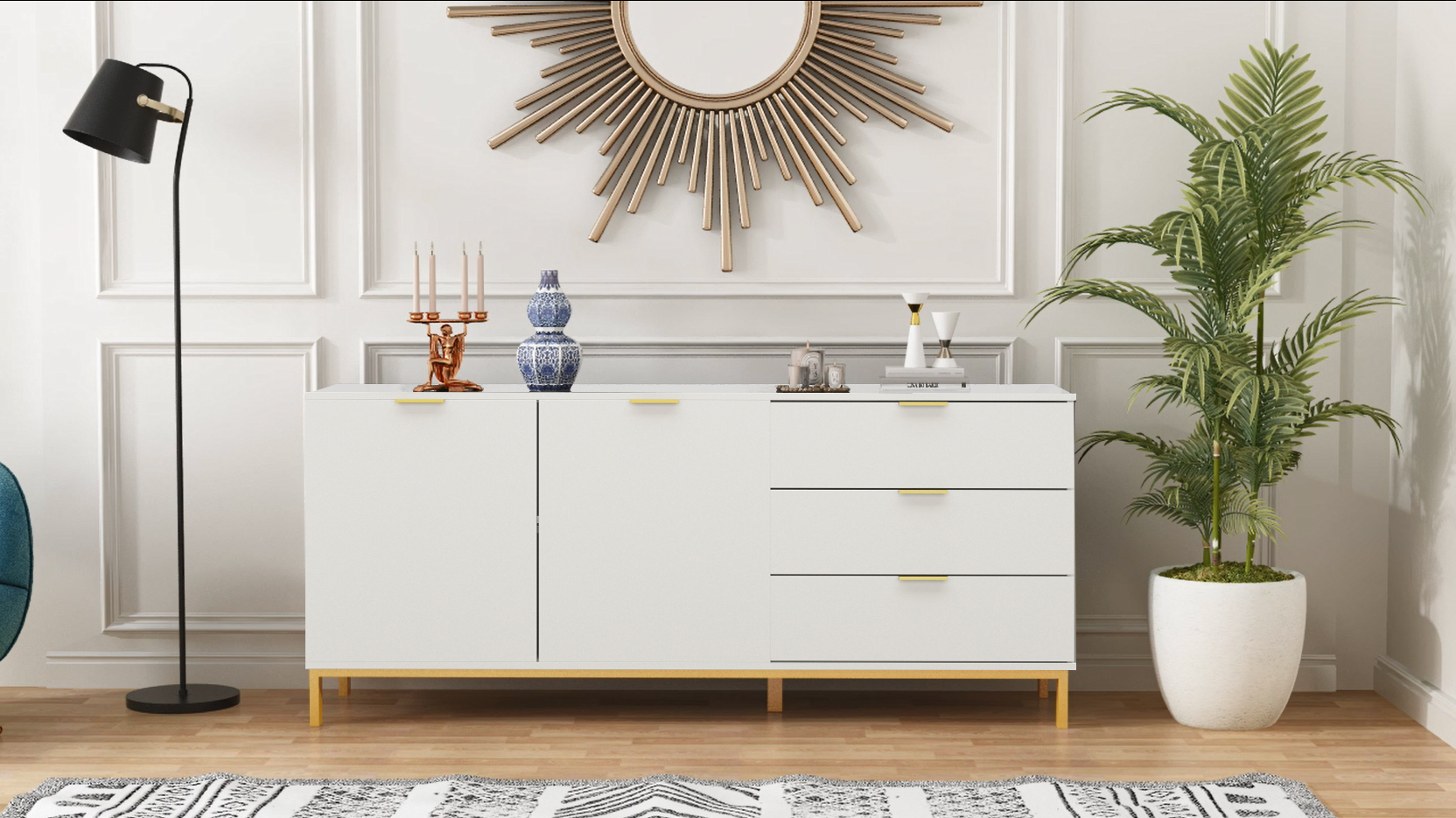 - 【Large Storage Space】3 spacious side drawers and cabinets with 2 doors, this buffet cabinet provides abundant space to store whatever you need. The 62.9 inch wooden top allows you to display your decorations, photo albums & TV set.